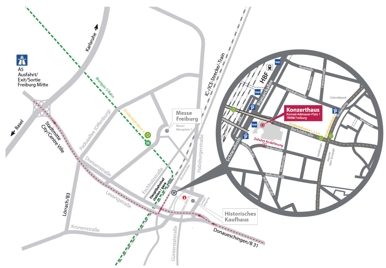 Von Norden und Süden über die Rheintalautobahn A5 Frankfurt-Basel nehmen Sie die Ausfahrt Freiburg Stadtmitte und folgen der Beschilderung zum Konzerthaus.